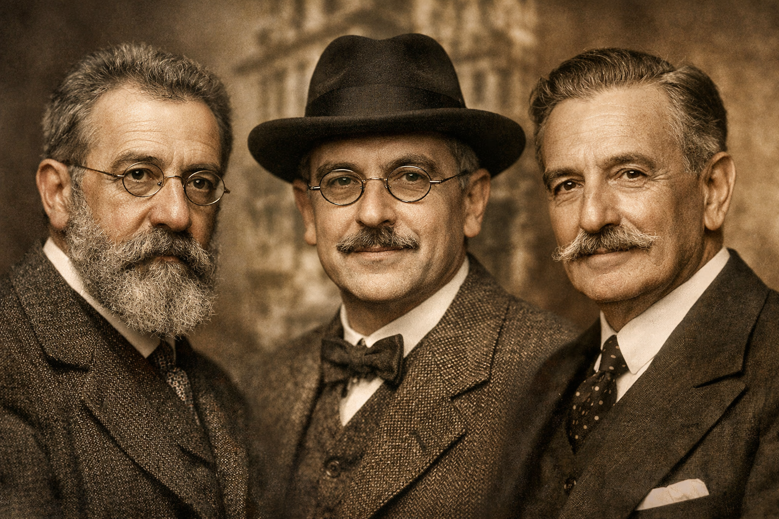 Three men in vintage suits, one with a beard, one with glasses and a hat, and one with a mustache.